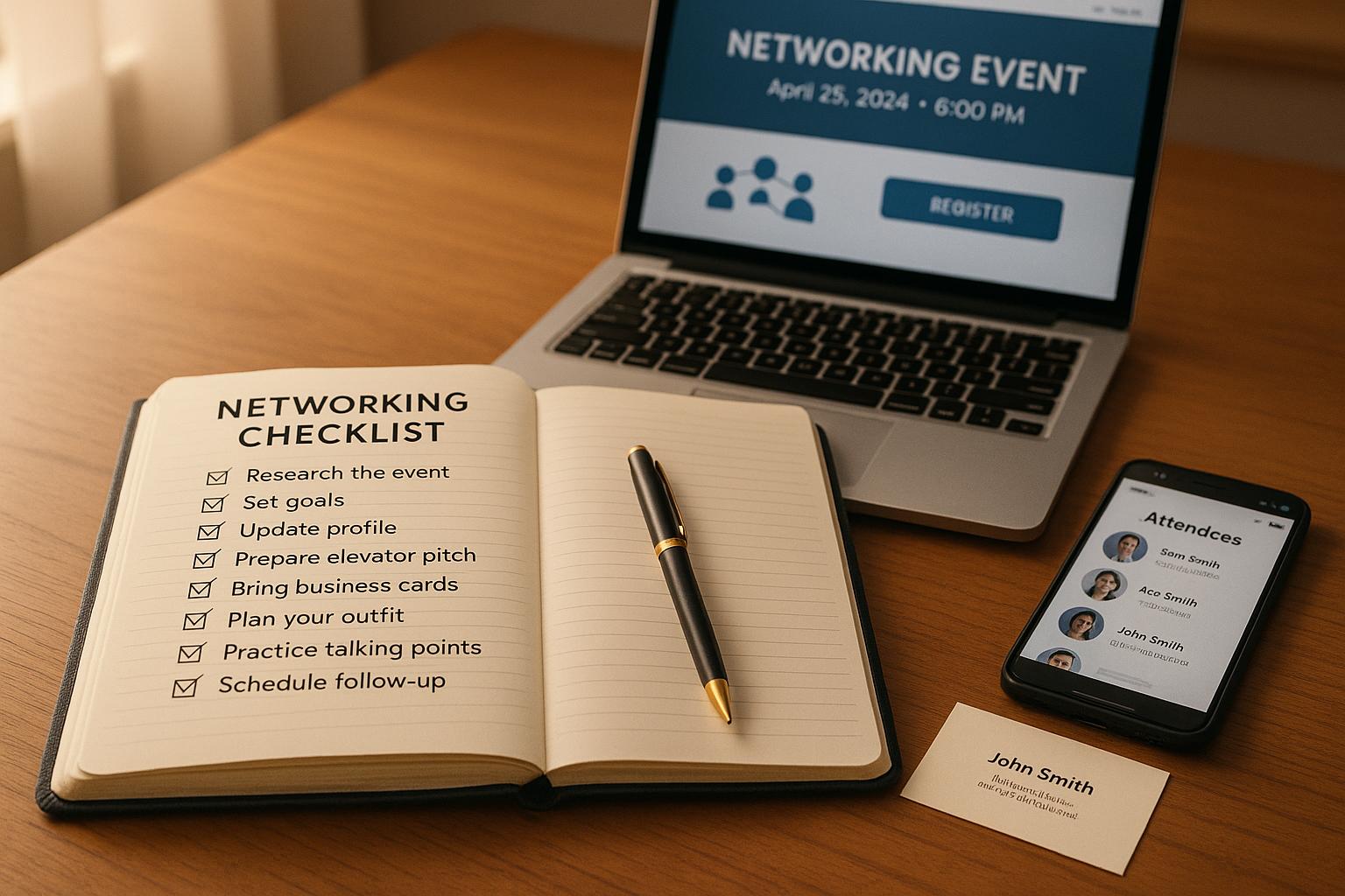 A practical pre-event checklist to set goals, research attendees, refine your profile and pitch, prepare tools, plan interactions and follow up.